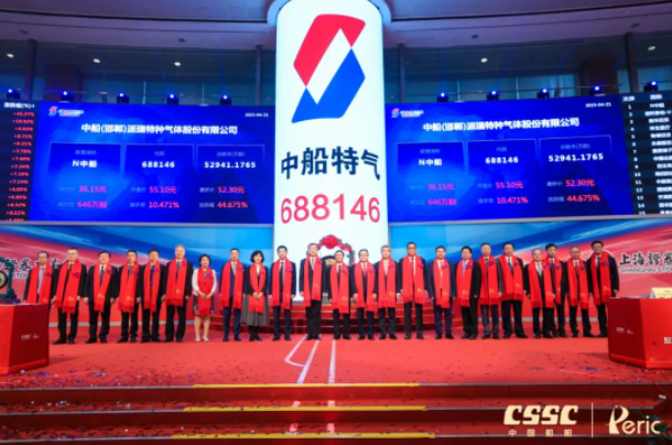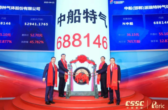 4月21日,中國船舶集團有限公司旗下中船(邯鄲)派瑞特種氣體股份有限公司(簡稱:中船特氣,證券代碼:688146)首次公開發行A股上市儀式在上海證券交易所舉行。這是中國船舶集團旗下第12家上市公司,也是集團公司重組后首家在科創板公開發行A股的上市公司。中國船舶集團黨組書記、董事長溫剛出席儀式,黨組成員、總會計師賈海英出席儀式并致辭,黨組成員、副總經理盛紀綱出席儀式。
