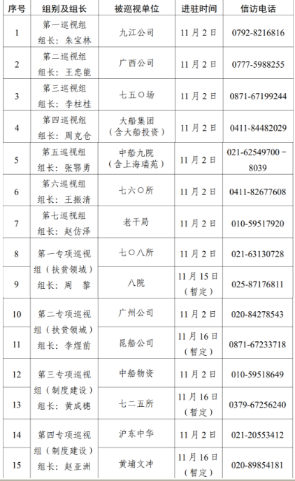 根據(jù)中國船舶集團(tuán)黨組對2020年第二輪巡視工作的統(tǒng)一部署,截止11月2日,集團(tuán)公司黨組7個(gè)常規(guī)巡視組已全部完成進(jìn)駐,對九江公司、廣西公司、七五〇場、大船集團(tuán)(含大船投資)、中船九院(含上海瑞苑)、七六〇所、老干局等7家單位開展常規(guī)巡視。集團(tuán)公司黨組4個(gè)專項(xiàng)巡視組采取“一托二”方式同步對七〇八所、八院、廣州公司、昆船公司、中船物資、七二五所、滬東中華、黃埔文沖等8家單位開展扶貧領(lǐng)域、制度建設(shè)專項(xiàng)巡視,4個(gè)專項(xiàng)巡視組目前均已進(jìn)駐首家被巡視單位。