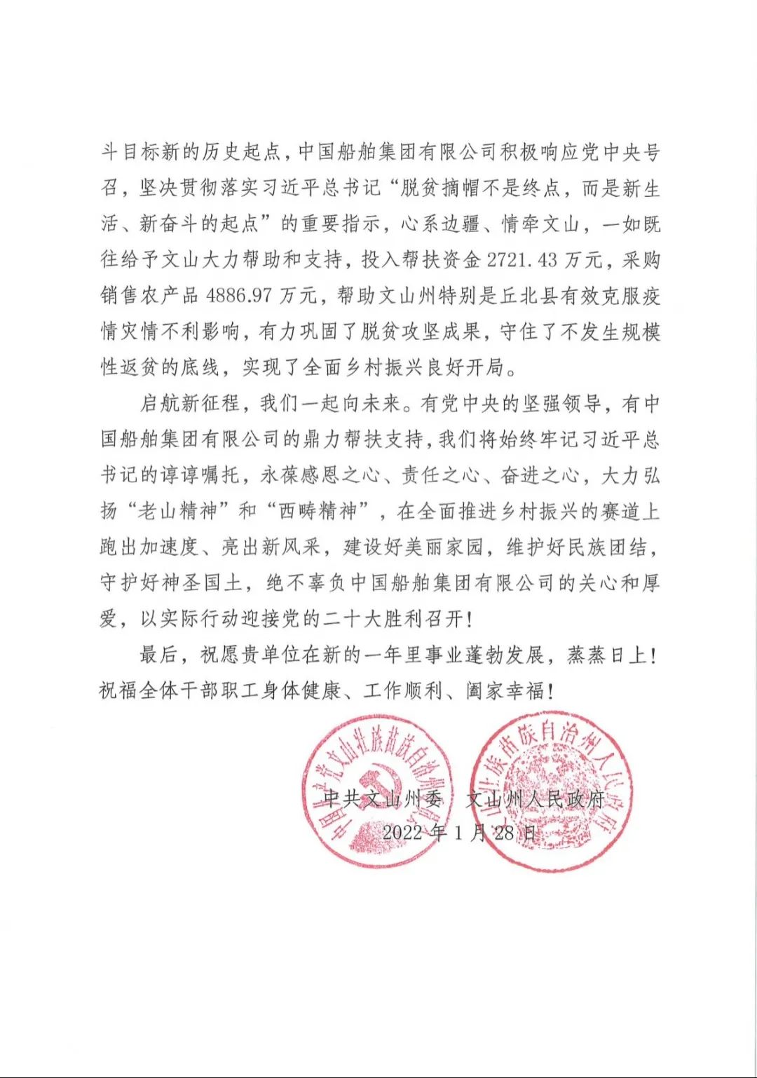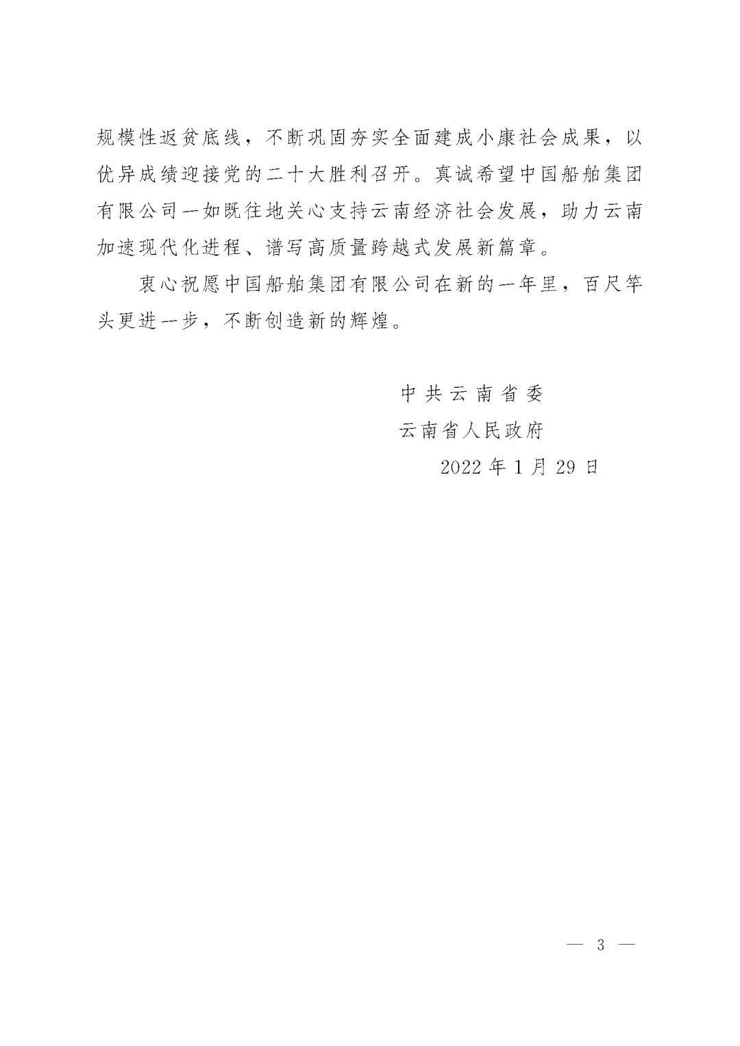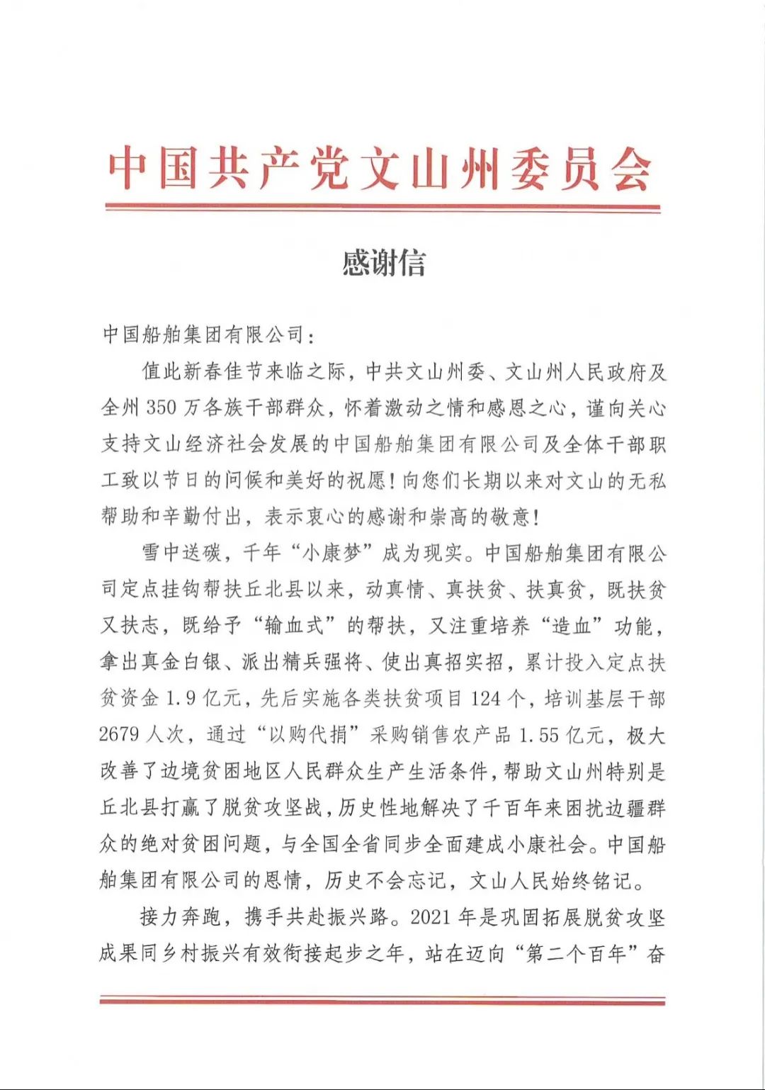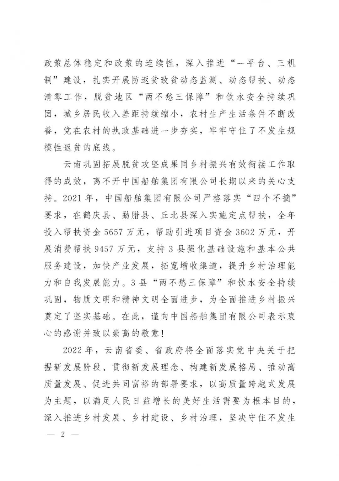 春節(jié)前夕,中國船舶集團(tuán)陸續(xù)收到云南省委省政府、文山州委州政府、鶴慶縣委縣政府、勐臘縣政府發(fā)來的感謝信,對集團(tuán)公司長期以來給予鶴慶縣、勐臘縣、丘北縣的傾力幫扶表示衷心感謝和崇高敬意。