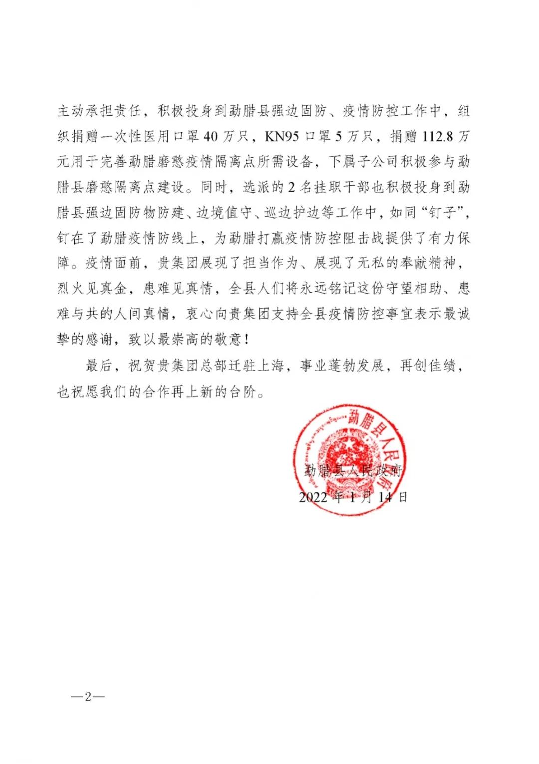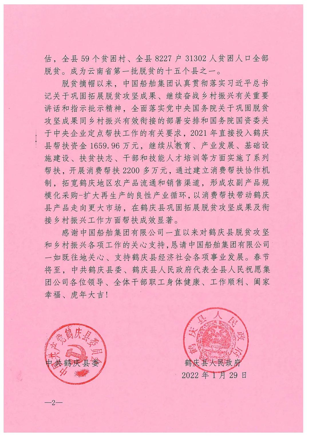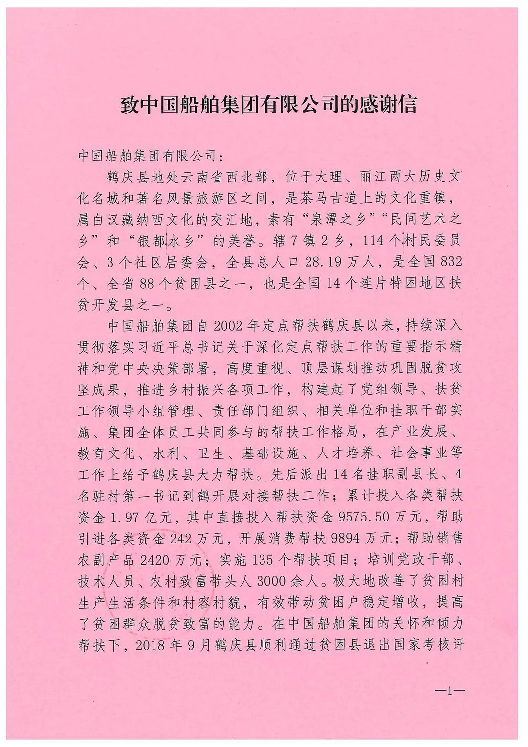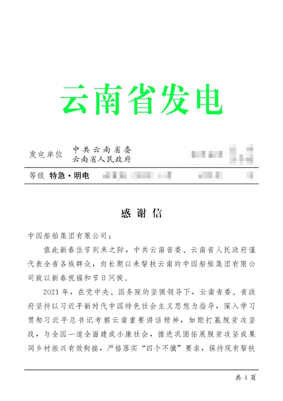 春節(jié)前夕,中國船舶集團(tuán)陸續(xù)收到云南省委省政府、文山州委州政府、鶴慶縣委縣政府、勐臘縣政府發(fā)來的感謝信,對集團(tuán)公司長期以來給予鶴慶縣、勐臘縣、丘北縣的傾力幫扶表示衷心感謝和崇高敬意。