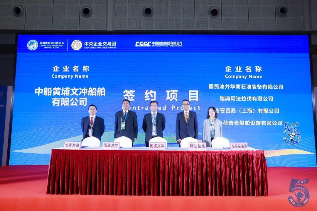 第五屆進博會期間,中國船舶集團旗下8家企業與18家國際合作伙伴先后進行21個項目的集中簽約,累計總金額達4.5億美元,同比增長205.5%。項目涉及柴油機組、發電機組、船用吊機、通導系統、電力推進系統、數字化網絡設備、LNG供氣系統、殷瓦鋼、再液化裝置等船舶建造領域的各類重要配套設備,為國際交易市場和全球供應鏈的日益繁榮貢獻中國船舶力量。
