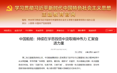 12月18日,學習貫徹習近平新時代中國特色社會主義思想主題教育官網發布《中國船舶:持續在學思踐悟中汲取精神偉力 匯聚奮進力量》。中國船舶集團通過繪好“施工圖”、念好“三字經”、用好“五字訣”等扎實開展好主題教育,切實以主題教育成果推動集團公司加快建設世界一流船舶集團。