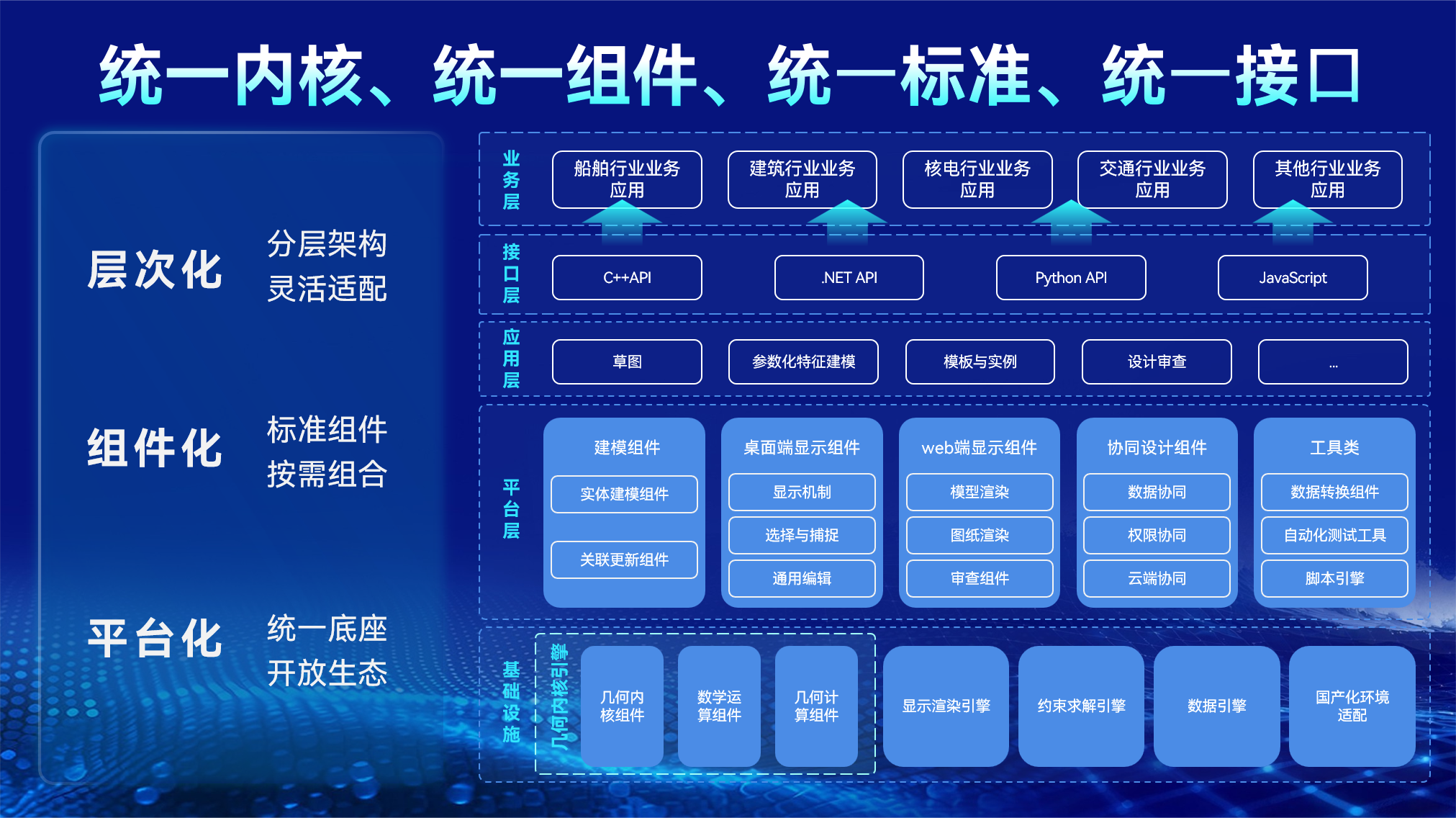 平臺(tái)確立了:統(tǒng)一內(nèi)核、統(tǒng)一組件、統(tǒng)一標(biāo)準(zhǔn)、統(tǒng)一接口的體系化架構(gòu)。