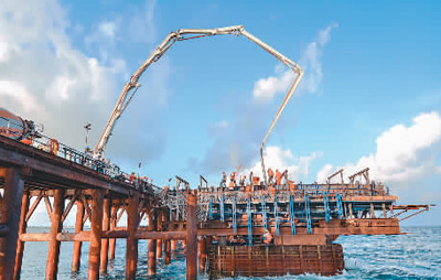 7月6日,隨著主橋23號(hào)墩承臺(tái)最后一車混凝土的澆筑,中國援馬爾代夫中馬友誼大橋5個(gè)主橋承臺(tái)全部施工完成,標(biāo)志著占全橋施工總量約70%的主橋部分從此徹底擺脫印度洋的強(qiáng)涌浪襲擾,進(jìn)入上部結(jié)構(gòu)施工階段。
