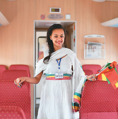 2016年10月5日,在埃塞俄比亞首都亞的斯亞貝巴,一名當(dāng)?shù)厝嗽嚦藖喖F路通車當(dāng)日的第一列旅客列車。新華社記者 孫瑞博攝