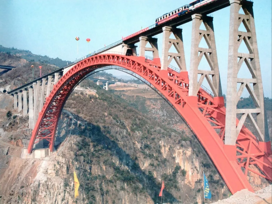 ▲1999年,研制了國內第一臺轉體球鉸。承載力120000千牛,應用在貴州水柏鐵路北盤江大橋,是世界上第一座上承式推力轉體式鐵路鋼管混凝土拱橋,創造了當時世界之最。
