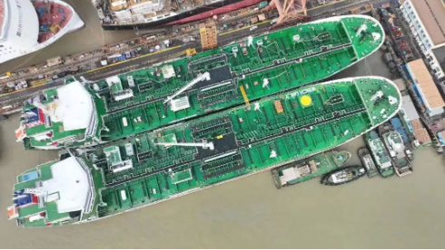 中國船舶集團(tuán)旗下廣船國際建造的國內(nèi)首型甲醇雙燃料動(dòng)力船2艘姊妹船肩并肩!