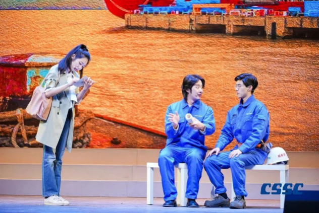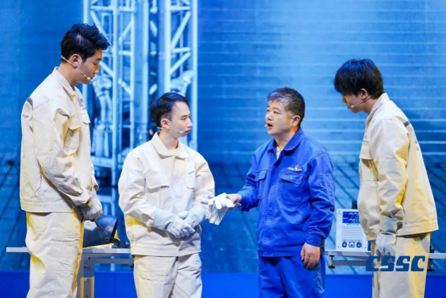 現(xiàn)場,來自中國船船集團江南造船(集團)有限責任公司、滬東中華造船(集團)有限公司、上海外高橋造船有限公司、中船動力(集團)有限公司和中國船舶集團公司第七〇二研究所的青年職工將真實工作案例與理論原文結合,將“發(fā)展新質(zhì)生產(chǎn)力”作為工作方向與指引,將他們的造船故事親身演繹。故事從《船舶青年說》起航,共講述了五大篇章,分別為江南造船如何延續(xù)百年初心、滬東中華造船LNG船毫厘鑄匠心、七〇二所從“蛟龍”號到“奮斗者”號將深潛進行到底、外高橋造船“愛達?魔都號”大型郵輪“4個120天”的極限挑戰(zhàn)、江南造船“鋼鐵心臟”工程師攻克大型作戰(zhàn)艦建造的不凡創(chuàng)新路,臺詞鏗鏘有力、情感真摯流淌,繪就了一幅精彩的中國船舶夢畫卷。