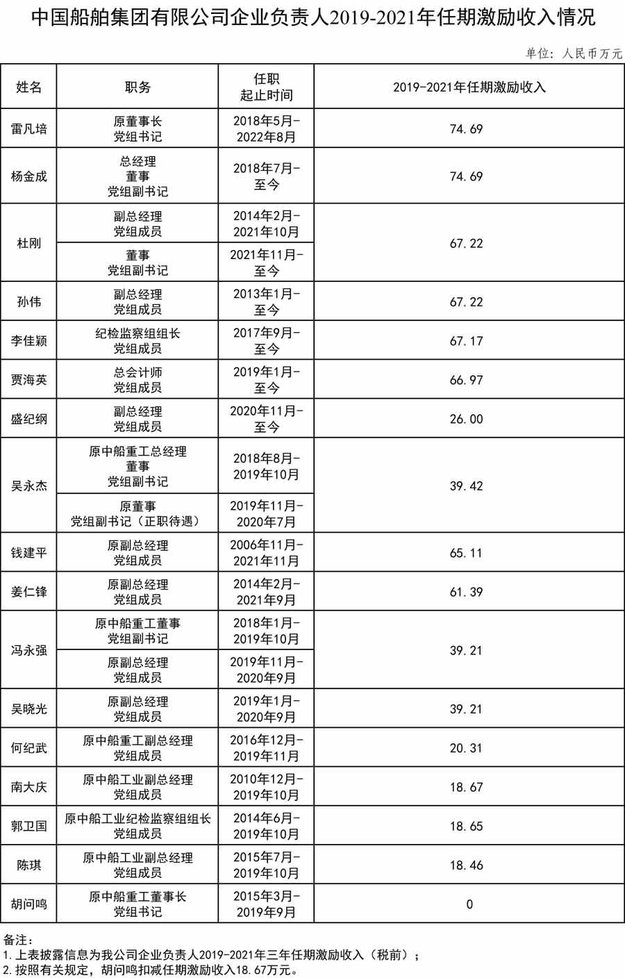 中國船舶集團有限公司企業(yè)負責人2019-2021年任期激勵收入情況