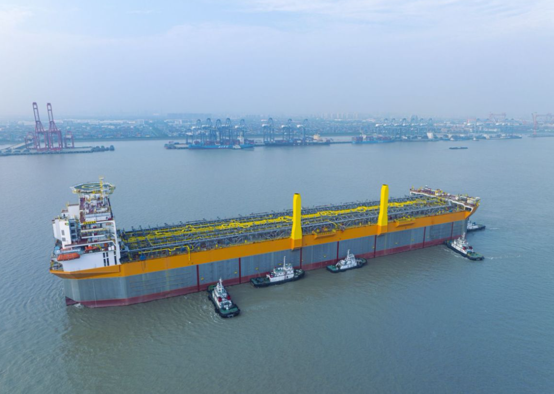 11月14日,由中國船舶集團旗下外高橋造船為荷蘭SBM OFFSHORE公司建造的第五艘世界獨創230萬桶通用型海上浮式生產儲油輪(FPSO)“捷豹”號簽字交付。
