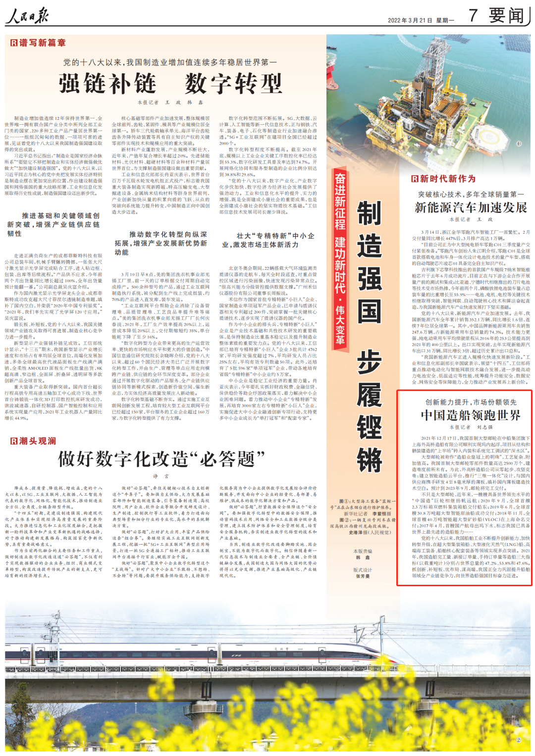 黨的十八大以來,我國船舶工業不斷提升創新能力、加快轉型升級,在超大型集裝箱船、大型液化天然氣(LNG)船、高端海工裝備、船舶核心配套裝備等領域實現多點突破。2021年,我國造船完工量、新接訂單量、手持訂單量等造船三大指標(以載重噸計)分別占世界總量的47.2%、53.8%和47.6%。抓創新、補短板、優布局、謀高端,我國正全力鞏固提升船舶領域全產業鏈競爭力,向世界造船強國目標奮力邁進。