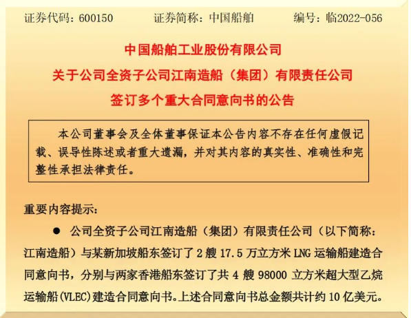 10月25日,中國船舶集團有限公司旗下上市公司中國船舶工業股份有限公司發布《關于公司全資子公司江南造船(集團)有限責任公司簽訂多個重大合同意向書》的公告。根據公告,江南造船共與相關船東簽署了2型6艘約10億美元新船建造合同意向書。