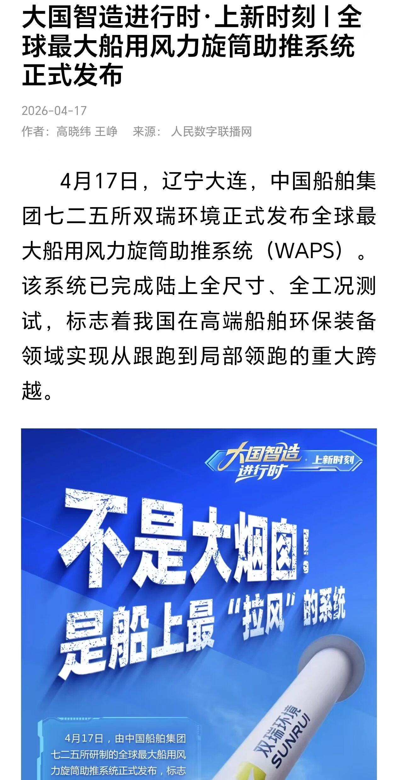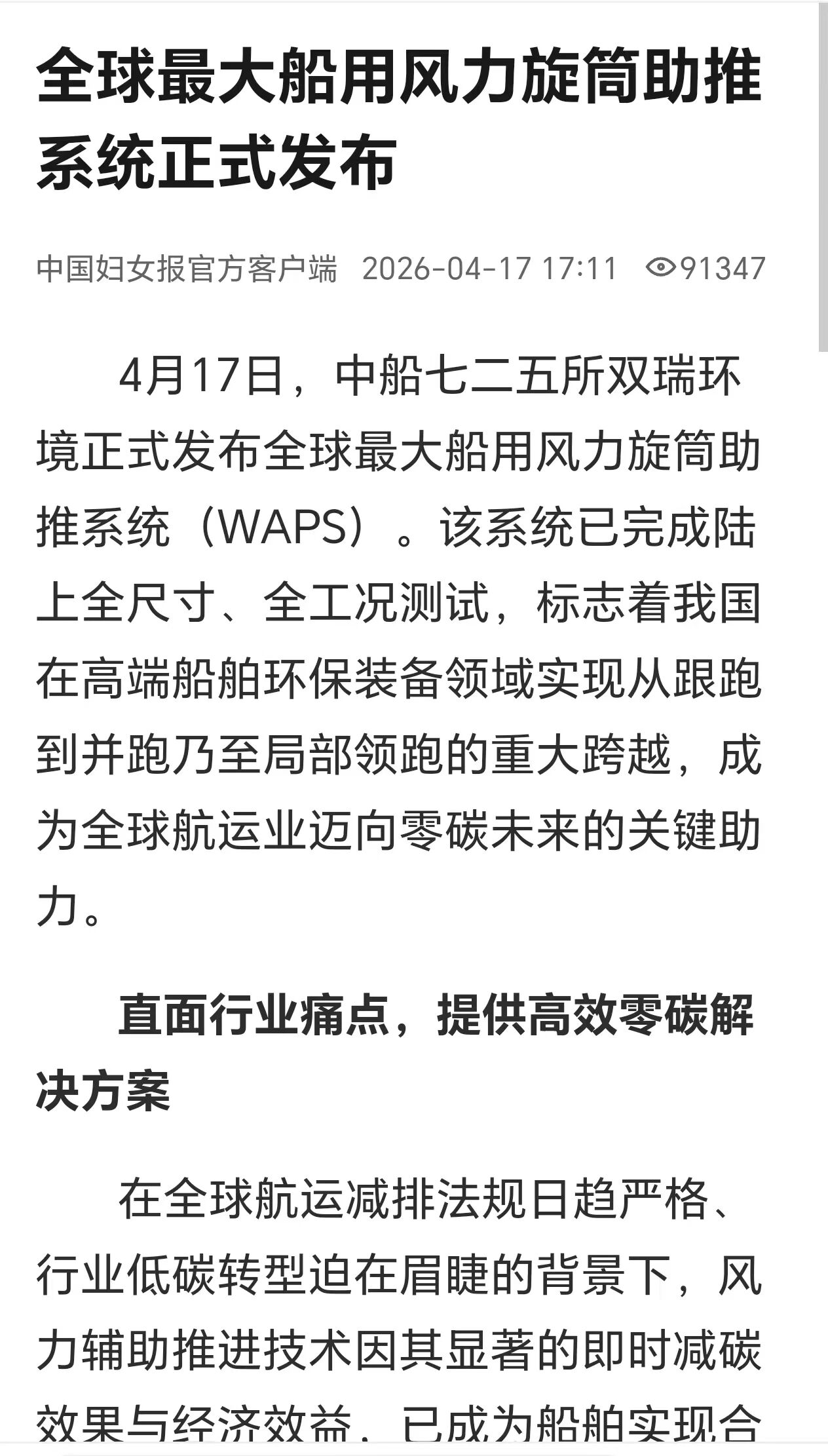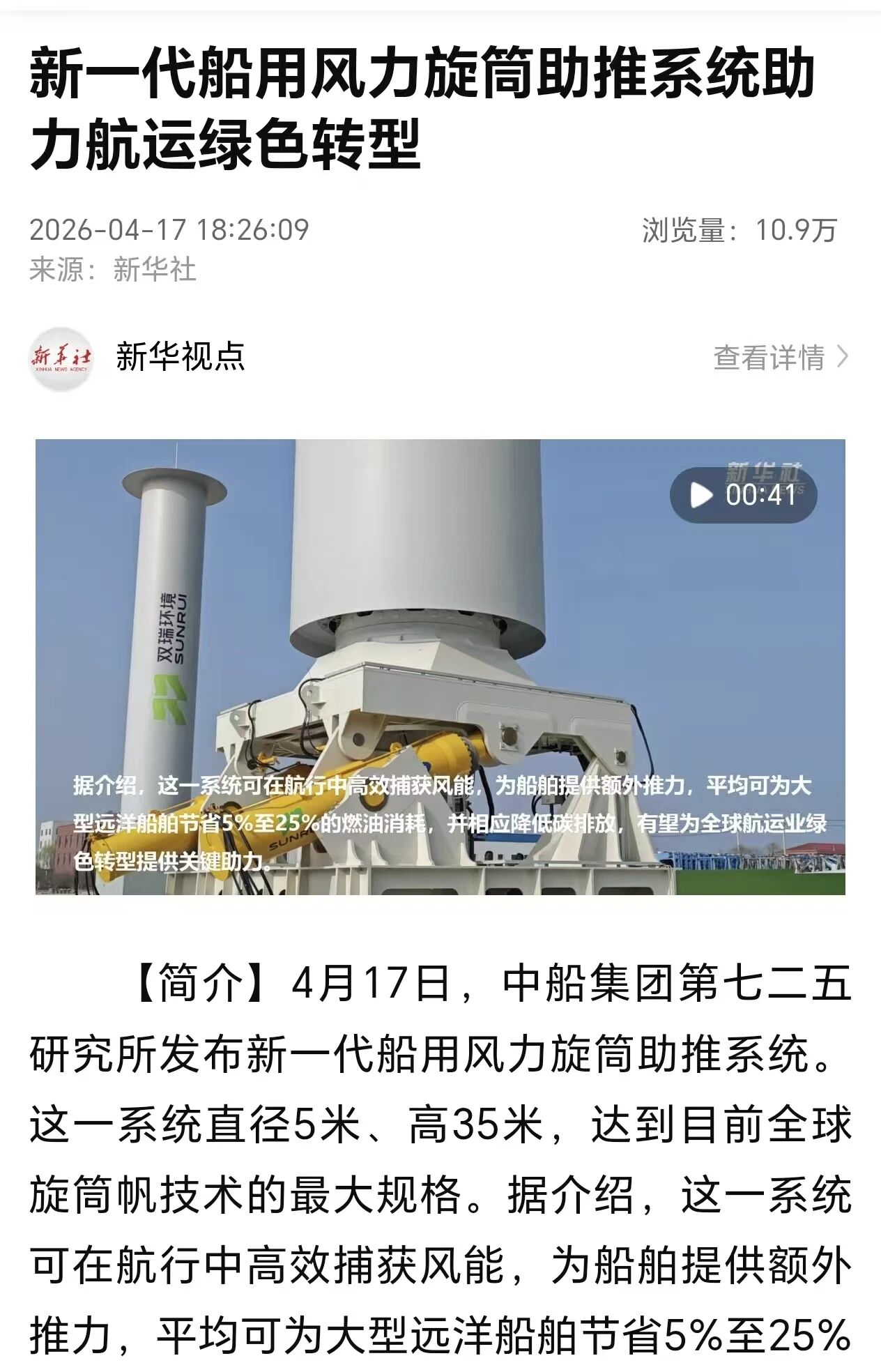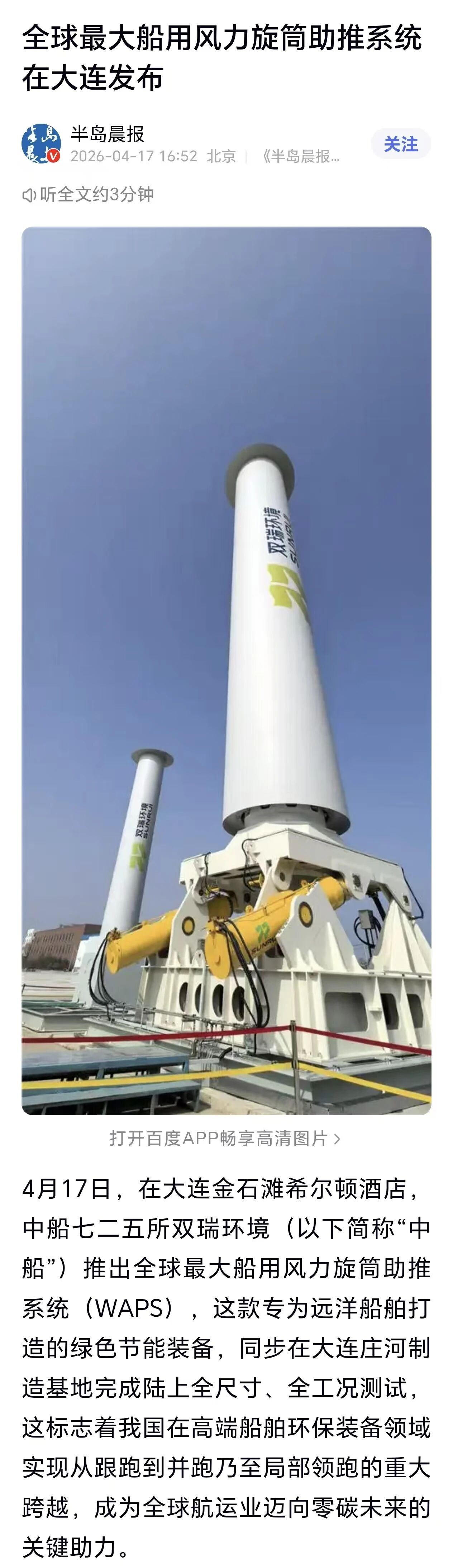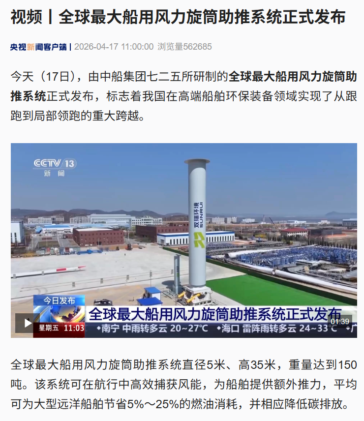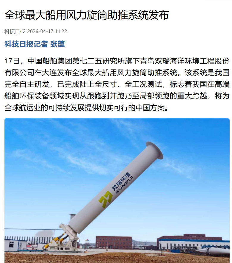 4月17日,中國船舶集團(tuán)有限公司七二五所旗下雙瑞環(huán)境正式發(fā)布全球最大船用風(fēng)力旋筒助推系統(tǒng)。